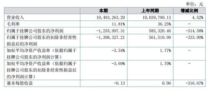 報告期內(nèi)公司實現(xiàn)營業(yè)收入1,049.32萬元,同期相比基本保持一致;凈利潤-125.60萬元,較上年同期下降314.58%。?