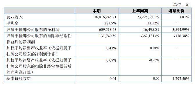 報(bào)告期內(nèi),公司全年實(shí)現(xiàn)營(yíng)業(yè)收入76,016,245.71元,比上年同期提升3.81%;利潤(rùn)總額440,286.29元,而上年同期為負(fù)值;歸屬母公司股東的凈利潤(rùn)609,518.63元,比上年同期提升3594.99%。?