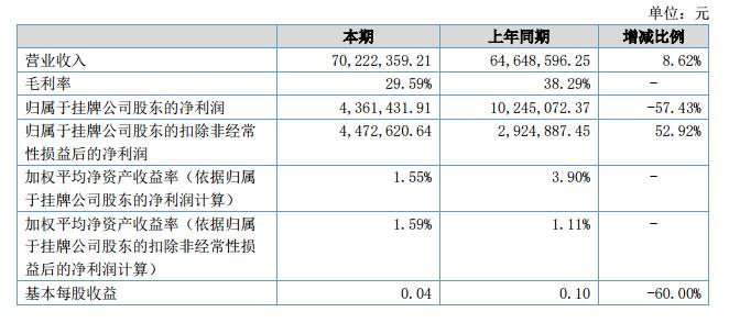 報(bào)告期內(nèi)公司營(yíng)業(yè)收入70,222,359.21元,比去年同期的64,648,596.25元,增長(zhǎng)了8.62%;公司凈利潤(rùn)3,693,998.78元,比去年同期的9,997,571.82元,下降了63.05%。
