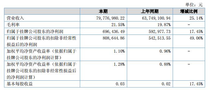 報(bào)告期內(nèi)公司實(shí)現(xiàn)營(yíng)業(yè)收入7,977.70萬元,同比增加1602.79萬元,增幅25.14%;實(shí)現(xiàn)歸屬于母公司凈利潤(rùn)69.64萬元,同比增加10.34萬元,增幅17.45%。?
