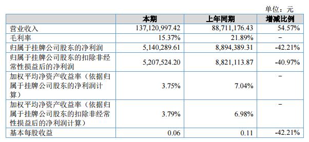 報告期內(nèi)公司實現(xiàn)營業(yè)收入13,712.10萬元,較上年同期增加4,840.98萬元,同比增長54.57%;2018年上半年,公司歸屬于母公司股東的凈利潤為514.03萬元,較上年同期減少375.41萬元,同比下降42.21%。?