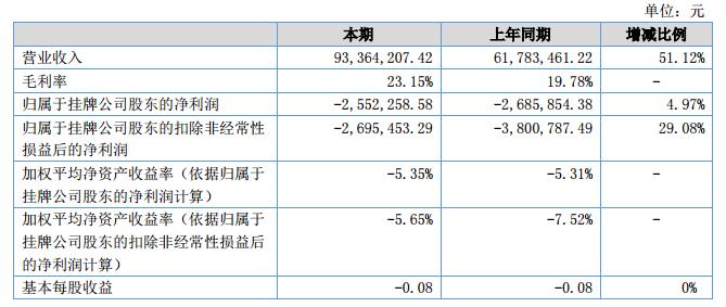 報告期內(nèi),公司實現(xiàn)營業(yè)收入為93,364,207.42元,較去年同期增加31,580,746.20元,增長51.11%;報告期內(nèi)實現(xiàn)綜合毛利率23.15%,比去年同期增加3.37%;歸屬于母公司股東的凈利潤為-2,552,258.58元,較去年同期減少虧損133,595.80元,增長4.97%。?