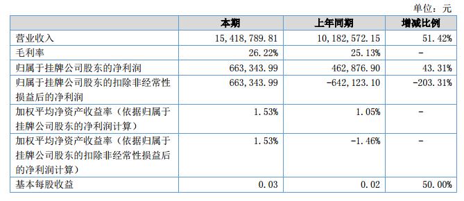 報告期內公司實現營業(yè)收入15,418,789.81元,同期增加51.42%;?凈利潤實現663,343.99元,同期增加41.64%?。