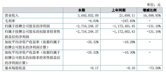 報告期內,營業(yè)收入3,645,032.09元,同比上升16698.85%;凈利潤-2,716,248.37元,同比下降131.16%。?