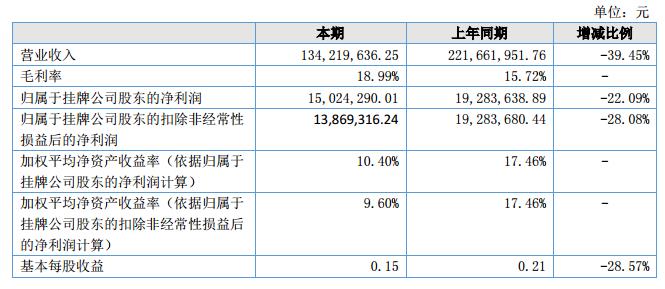 公司實現(xiàn)營業(yè)收入134,219,636.25元,較上年同期下降39.45%;營業(yè)成本108,727,275.83元,較上年同期下降41.80%;公司實現(xiàn)凈利潤15,024,290.01元,較上年同期下降22.09%。?