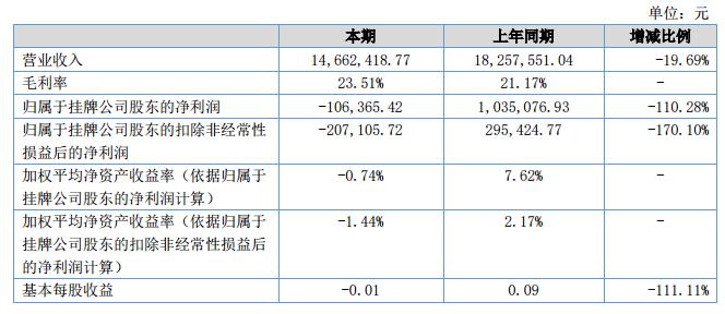 報告期內(nèi)公司實現(xiàn)銷售收入1,466.24萬元,較上年同期減少19.69%;凈利潤-10.64萬元,同比減少110.28%。
