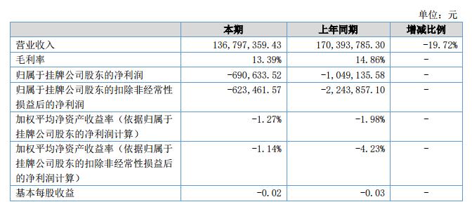 報告期內公司實現(xiàn)營業(yè)收入1.37億,較上年同期1.70億減少3,360萬,同比下降19.72%;報告期實現(xiàn)凈利潤-68萬,較上年同期-104萬減少虧損36萬。?