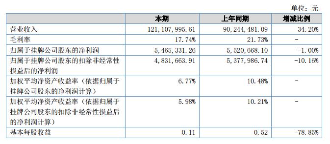 報告期內(nèi),公司實現(xiàn)營業(yè)收入121,107,995.61元,較上年同期90,244,481.09元,增長了34.20%;營業(yè)成本99,625,224.96元,較上年同期70,631,079.20元,增長了41.05%;凈利潤5,465,331.26元,較上年同期5,520,668.10元,減少了1.00%。?
