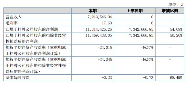 報(bào)告期內(nèi),公司2018年上半年實(shí)現(xiàn)營(yíng)業(yè)收入7,213,546.04元,歸屬于母公司的凈利潤(rùn)為-11,314,426.26元,比上年同期增長(zhǎng)-54.09%。?