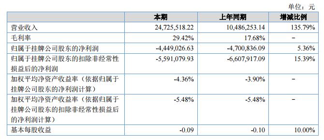 報告期內(nèi),公司實現(xiàn)營業(yè)收入為24,725,518.22元,上年同期為10,486,253.14元,營業(yè)收入較上年同期增加14,239,265.08元,增加比例為135.79%;公司實現(xiàn)凈利潤為-4,344,007.65元,上年同期為-5,101,792.99元,公司收入增加135.79%,凈利潤提高14.85%?。