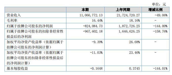 報(bào)告期內(nèi),公司實(shí)現(xiàn)營(yíng)業(yè)收入11,066,772.13元,上年同期營(yíng)業(yè)收入21,724,720.27元,較上年同期減少49.06%;凈利潤(rùn)報(bào)告期內(nèi),公司凈利潤(rùn)-824,084.73元,上年同期凈利潤(rùn)1,872,726.25元,較上年同期減少144.00%。