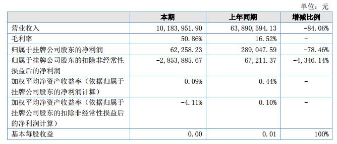 公司經(jīng)營(yíng)成果:截止報(bào)告期末,公司營(yíng)業(yè)收入為10,183,951.90元,較去年同期減少84.06%;歸屬于母公司所有者的凈利潤(rùn)為62,258.23元,較上年期末減少78.46%。?