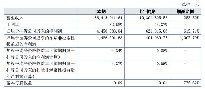 報(bào)告期內(nèi),公司實(shí)現(xiàn)營(yíng)業(yè)收入36,415,011.64元,比上年同期增加26,113,706.12元,增長(zhǎng)率為253.50%;公司實(shí)現(xiàn)營(yíng)業(yè)利潤(rùn)5,040,045.10元,比上年同期增加4,352,251.63元,增長(zhǎng)比率為632.78%,實(shí)現(xiàn)凈利潤(rùn)4,450,383.04元,比上年同期增加3,828,567.98元,增長(zhǎng)比率為615.71%。