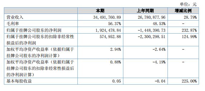 報(bào)告期內(nèi),公司實(shí)現(xiàn)營(yíng)業(yè)收入3,449.18萬(wàn)元,同比上升28.79%;毛利率從上年同期的48.53%上升到56.37%;歸屬掛牌公司股東的凈利潤(rùn)192.45萬(wàn)元,相比上年同期大幅提升232.87%。