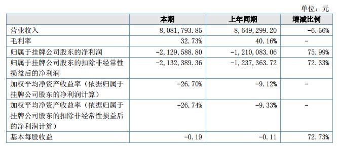 2018年上半年,公司實(shí)現(xiàn)營(yíng)業(yè)總收入8,081,793.85元,同比下降6.56%;毛利率32.73%,同比下降了7.43%;歸屬于掛牌公司股東的凈利潤(rùn)為-2,129,588.80元,同比下降75.99%?