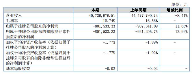 報(bào)告期內(nèi)公司實(shí)現(xiàn)營業(yè)收入4,073.67萬元,營業(yè)收入增長率-8.41%;銷售毛利率18.74%;資產(chǎn)總計(jì)11,698.19萬元,總資產(chǎn)增長率0.81%;歸屬于掛牌公司股東的凈資產(chǎn)4,492.69萬元,與上年同期比降幅1.75%;歸屬于掛牌公司股東的每股凈資產(chǎn)1.14元,與上年同期比降幅1.72%。?