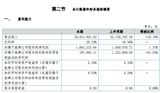 2. 公司經(jīng)營成果: 報告期內(nèi)公司實現(xiàn)營業(yè)收入 28,871,891.62,較上年同期下降 10.16%,主要原因是美國對中國進口關(guān)稅的提高,對客人產(chǎn)生采購成本的增加,導(dǎo)致購買力下降。報告期內(nèi)公司毛利率為 29.25%較上年同期下降 6.70%,主要受匯率影響報告期內(nèi)的平均匯率較去年同期降幅 8.06%導(dǎo)致同期出口美元數(shù)相同但計入主營業(yè)務(wù)收入的金額減少。報告期內(nèi)實現(xiàn)扣非后的凈利潤 107,893.11 元較同期減少 1,214,195.99 元降幅 91.84%,其原因是我司是出口貿(mào)易型企業(yè)成交方式是以美元為結(jié)算,美元匯率與去年同期美元平均匯率下降 8.06%。實現(xiàn)的凈利潤 1,063,315.66 元,較去年同期增加了 14,335.94 元,漲幅 1.37%。主要是政府獎勵較去年同期加 1,124,026.53 元。