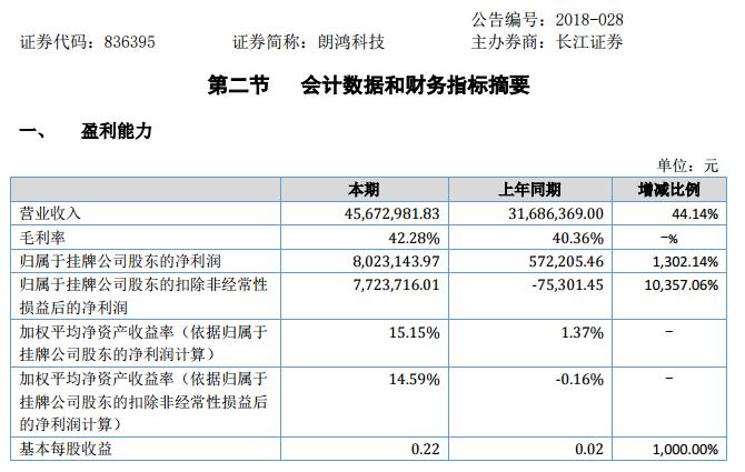 挖貝網(wǎng)訊 9月8日消息,朗鴻科技(證券代碼:836395)近日公布的2018年半年報顯示,截至2018年6月30日,企業(yè)實現(xiàn)營收4567.3萬元;歸屬于掛牌公司股東的凈利潤為802萬元。