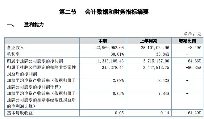 營業(yè)利潤為 170.08 萬元,上年同期 405.15 萬元,同比下降 58.02%。凈利潤 128.60 萬元,上年同期 371.52 萬元,同比下降 65.39%;扣除非經(jīng)常性損益后的凈利潤 31.54 萬元,上年同期 344.79 萬元,同比下降 90.85%。報(bào)告期內(nèi)營業(yè)利潤及凈利潤下降的主要原因?yàn)椋菏紫?,上半年公司通過勞務(wù)公司聘用多名生產(chǎn)線臨時(shí)工人,導(dǎo)致人工成本較大幅度增長;其次,為增加團(tuán)隊(duì)凝聚力,上半年公司組織團(tuán)隊(duì)拓展活動(dòng)及上年度總結(jié)會(huì)議,使得管理費(fèi)增加。