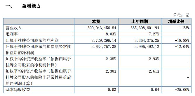 報告期內(nèi),公司實現(xiàn)營業(yè)收入 39,004,35 萬元,同比增加 1.23% ;營業(yè)成本 35,872.81 萬元,同比增加 0.40%;利潤總額和凈利潤分別為 364.22 萬元和 272.93 萬元,分別比上期減少 18.66%和 18.88% ;報告期內(nèi)經(jīng)營活動現(xiàn)金流量凈額為-73.09 萬元,相比于去年同期上升 97.42%;報告期末,歸屬于掛牌公司股東的凈資產(chǎn) 10,942.97 萬元,比去年末下降 3.31%。 報告期內(nèi)批發(fā)業(yè)務穩(wěn)步增加,凈利潤較去年同期增加 36.84%,零售業(yè)務由于市場競爭激烈,費用增加等原因?qū)е聝衾麧櫷葴p少 219.42%。