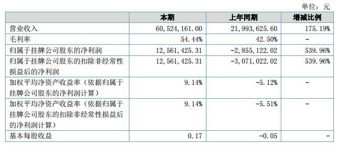 報(bào)告期內(nèi),公司實(shí)現(xiàn)營(yíng)業(yè)總收入6,052.42萬(wàn)元,同比增長(zhǎng)175.19%;綜合毛利率54.44%,相比2017年同期提高11.94%;公司實(shí)現(xiàn)歸屬于母公司所有者的凈利潤(rùn)1,256.14萬(wàn)元,同比增長(zhǎng)539.96%。