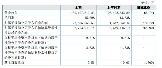 報告期內(nèi)公司實現(xiàn)營業(yè)收入15,910.76萬元,比上年同期增長了66.74%。實現(xiàn)凈利潤2,380.51萬元,較去年同期增長了1,672.72%。?