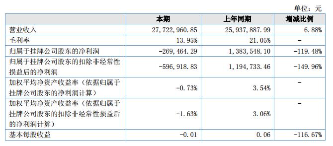 報(bào)告期內(nèi),公司實(shí)現(xiàn)營業(yè)收入2,772.30萬元,同比增長6.88%;毛利率13.95%,較上年同期的21.05%下降7.10%;凈利潤-173.61萬元,同比下降227.76%;歸屬于母公司所有者的凈利潤-26.95萬元,同比下降119.48%。?