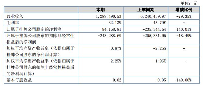 報告期內(nèi)公司實現(xiàn)營業(yè)收入1,288,490.53元,較上年同期減少79.35%;與此同時營業(yè)成本874,393.02元,較上年同期減少74.15%;報告期內(nèi)毛利率32.13%,上年同期45.79,毛利率同比下降13.66%;實現(xiàn)凈利潤94,168.81元,較上年同期增加近33萬。?