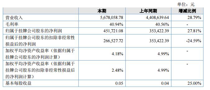 報(bào)告期內(nèi)公司實(shí)現(xiàn)營(yíng)業(yè)收入567.81萬元,比上年同期增長(zhǎng)28.79%;報(bào)告期實(shí)現(xiàn)歸屬于掛牌公司股東的凈利潤(rùn)為45.17萬元,比上年同期降低10.93%。?