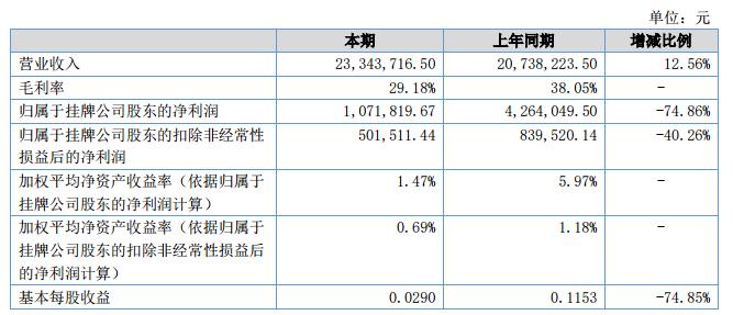 報告期內(nèi),公司實現(xiàn)營業(yè)收入2,334.37萬元,較上年同期2,073.82萬元增加12.56%;公司實現(xiàn)凈利潤107.18萬元,較上年同期426.40萬元下降74.86%。?