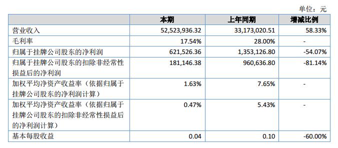 報告期內,公司實現(xiàn)營業(yè)收入5,252.39萬元,同比增長58.33%,實現(xiàn)凈利潤62.15萬元,同比減少54.07%。資產總額5,396.52萬元,比上年度末增長1.11%,凈資產3,854.95萬元。?