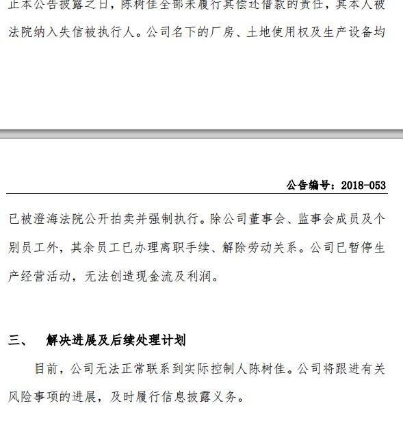 目前,公司無法正常聯(lián)系到實際控制人陳樹佳。
