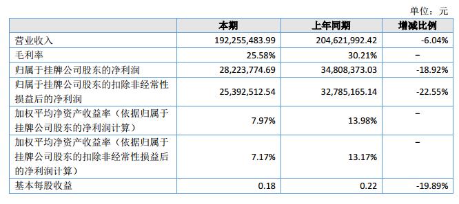 報(bào)告期內(nèi)營業(yè)收入192,255,483.99元,同比減少6.04%;利潤總額和凈利潤分別為32,467,862.89元、28,223,774.69元,同比減少19.2%、18.92%,?