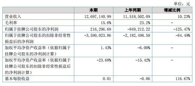 報告期內,公司實現(xiàn)營業(yè)收入12,697,140.99元,較去年同比上升10.23%;凈利潤216,296.69元,較去年同比增加-125.47%。