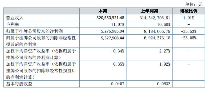 報(bào)告期內(nèi),公司實(shí)現(xiàn)營(yíng)業(yè)收入32,055.05萬(wàn)元,較上年同期增加了600.78萬(wàn)元,增加比例1.91%;營(yíng)業(yè)成本較去年同期增加386.55萬(wàn)元,增加比例1.37%?;實(shí)現(xiàn)凈利潤(rùn)527.70萬(wàn)元,較上年同期減少296.55萬(wàn)元,同比下降35.98%。?