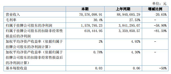 2018年上半年,營業(yè)收入為70,576,098.91元,與上年同期相比下降20.65%;營業(yè)成本為49,102,374.24元,與上年同期相比下降23.82%;凈利潤為1,578,795.23元,與上年同期相比下降58.90%。