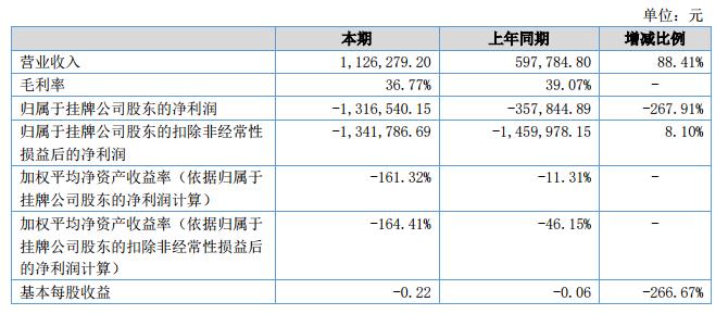 公司報(bào)告期內(nèi)實(shí)現(xiàn)營(yíng)業(yè)收入112.63萬元,比去年同期增加52.85萬元,增加了88.41%;實(shí)現(xiàn)營(yíng)業(yè)成本71.22萬元,比去年同期增加34.79萬元,增加了95.52%;實(shí)現(xiàn)凈利潤(rùn)-131.65萬元,比去年同期減少95.87萬元,減少了267.91%。實(shí)現(xiàn)現(xiàn)金及現(xiàn)金等價(jià)物凈增加額2.64萬元,較上年同期現(xiàn)金及現(xiàn)金等價(jià)物凈增加額-20.49萬元,增加了112.89%。?