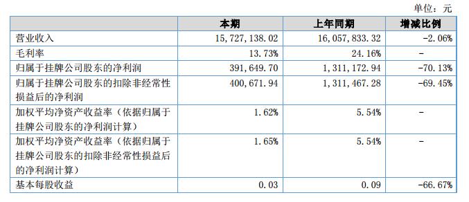 報(bào)告期內(nèi),公司利潤(rùn)表中,本期實(shí)現(xiàn)營(yíng)業(yè)收入1,572.71萬(wàn)元,去年同期實(shí)現(xiàn)營(yíng)業(yè)收入1,605.78萬(wàn)元,同比減少2.06%,主要原因?yàn)楣緲I(yè)務(wù)量減少,收入下降;營(yíng)業(yè)總成本本期金額1,513.37萬(wàn)元,去年同期營(yíng)業(yè)總成本金額為1,417.30萬(wàn)元,相比2017年同期增加了11.41%,主要原因?yàn)楸灸甓葮I(yè)務(wù)代墊費(fèi)用增加,成本增加;凈利潤(rùn)本期金額39.16萬(wàn)元,去年同期凈利潤(rùn)金額131.12萬(wàn)元,相比2017年同期減少了70.13%,主要原因?yàn)槿ツ晖诎l(fā)生政府新三板補(bǔ)助收入140萬(wàn)元。?
