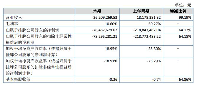報告期內(nèi),公司實(shí)現(xiàn)營業(yè)收入36,209,269.53元,同比增長99.19%,公司營業(yè)成本為40,078,411.64元,同比增長441.33%;公司經(jīng)營活動產(chǎn)生的現(xiàn)金流量凈額為-47,210,624.48元,同比增加67.10%;公司歸屬于掛牌公司股東的凈利潤為-78,524,463.10元,同比減少虧損64.12%。?