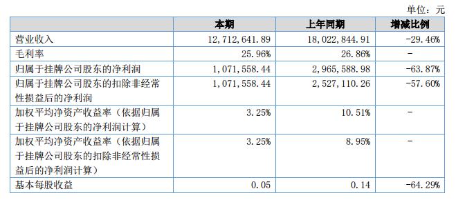 報(bào)告期內(nèi),公司財(cái)務(wù)狀況的變化趨勢(shì)是公司共實(shí)現(xiàn)的營業(yè)收入12,712,641.89元,同比下降了29.46%,資產(chǎn)總額56,915,649.81元,同比下降了3.73%,實(shí)現(xiàn)凈利潤(rùn)1,069,450.91元,同比下降了64.17%。報(bào)告期內(nèi)營業(yè)收入、凈利潤(rùn)下降主要原因是因?yàn)楣拘潞炗喒こ毯贤┕すて谠?018年下半年,業(yè)績(jī)主要在下半年的財(cái)報(bào)中體現(xiàn)。?