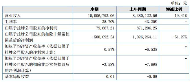 公司在報告期內(nèi)的主營業(yè)務(wù)收入為10,006,793.06元,比上年度增長19.41%;營業(yè)成本為6,434,007.95,比上年度增長35.18%;歸屬于母公司的凈利潤為79,667.21元,比上年度增長109.14%。主要變化的原因是收入增加以及鐵塔項目服務(wù)費減少導(dǎo)致的。?