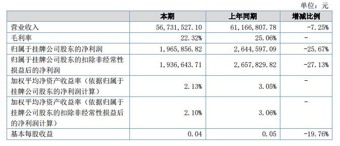 公司實現(xiàn)營業(yè)收入56,731,527.1元,同比下降7.25%;實現(xiàn)銷售毛利率22.32%,同比下降2.74%;歸屬于母公司的凈利潤1,965,856.82元,同比下降25.67%。?