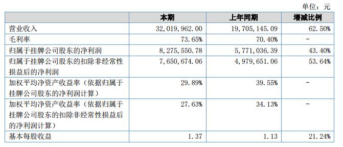 報(bào)告期內(nèi),公司實(shí)現(xiàn)合并報(bào)表營業(yè)收入32,019,962.00元,較上年同期增長62.50%;合并報(bào)表營業(yè)成本投入8,436,052.91元,較上年同期上升44.64%;實(shí)現(xiàn)歸屬于母公司股東的凈利潤為8,275,550.78元,較上年同期增長42.41%。?