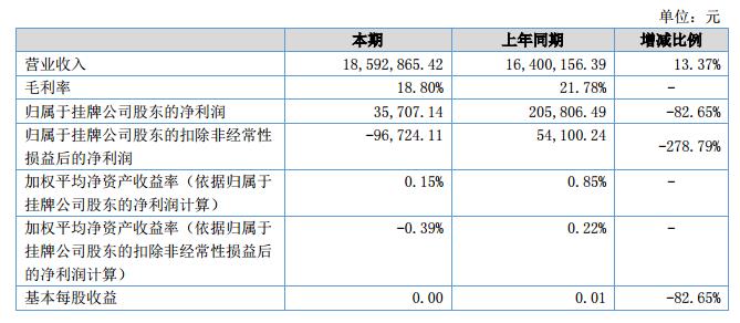 截止本報告期末,資產(chǎn)總額49,220,620.61元,較期初增長7.85%;本期實現(xiàn)營業(yè)收入18,592,865.42元,較去年同期增長13.37%,主要系報告期內(nèi)公司業(yè)務拓展后業(yè)務訂單增加所致,使得公司營業(yè)收入大幅增加;本期營業(yè)成本15,097,281.47元,較去年同期增長17.68%,主要系訂單增加且原材料價格上漲所致;本期毛利率18.80%,凈利潤35,707.14元,系因本期原材料價格上漲,導致毛利率有所下降;本期經(jīng)營活動產(chǎn)生的現(xiàn)金流量凈額7,993,341.21元,主要系公司本期預收賬款增加所致。