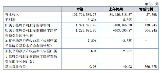 報告期內,公司主營業(yè)務收入為107,721,589.75元,較去年同期增長27.59%;歸屬于掛牌公司股東的凈利潤為1,324,322.48元,而去年同期為-400,166.78元,主要因為業(yè)務增加導致公司業(yè)績大幅改善。歸屬于掛牌公司股東的每股凈資產為1.2元,較去年同期增長7.14%。?
