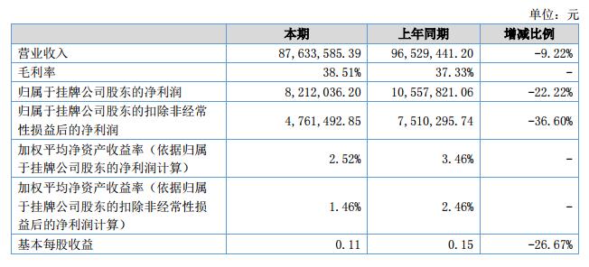 報告期內(nèi)公司實現(xiàn)營業(yè)收入8,763.36萬元,同比減少9.22%;實現(xiàn)歸屬于掛牌公司股東的凈利潤821.20萬元,同比減少22.22%。截至2018年6月30日,公司資產(chǎn)總額51,005.24萬元,同比增長2.71%。經(jīng)營活動產(chǎn)生的現(xiàn)金流量凈額-1,514.50萬元,較上年同期有所增長。?