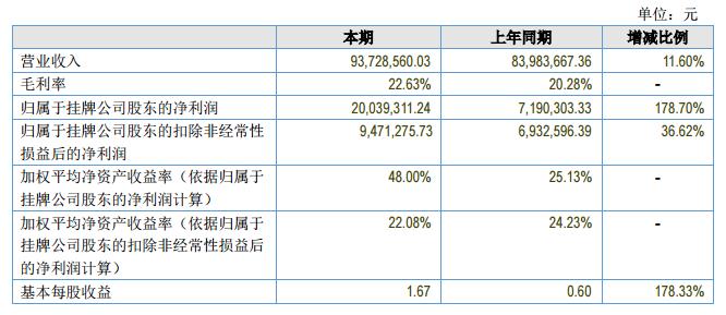 公司在報告期內(nèi)的營業(yè)收入為93,728,560.03比上年度增長11.60%;營業(yè)成本為72,519,362.82,比上年度增長8.31%;歸屬于母公司的凈利潤為20,039,311.24,比上年度增長178.70%。?