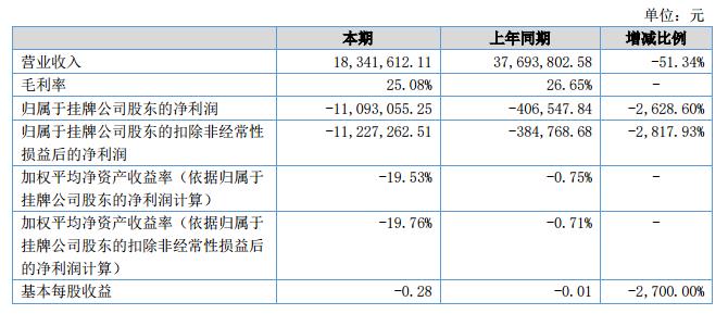 報(bào)告期內(nèi)公司總收入為18,341,612.11元,比上年同期減少51.34%;凈利潤(rùn)為-11,093,055.25元,比上年同期增加虧損10,686,507.41萬元;總資產(chǎn)為107,110,649.04元,比期初減少14.53%;凈資產(chǎn)為35,260,737.10元,比期初減少43.45%;公司2018年上半年毛利率比去年同期稍有下降,為25.08%?。