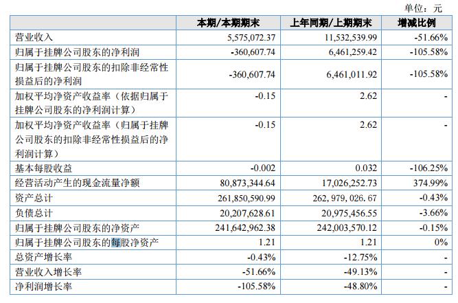 報(bào)告期,實(shí)現(xiàn)營業(yè)收入5,575,072.37元,較上年同期減少了51.66%;實(shí)現(xiàn)凈利潤-360,607.74元,較上年同期減少了105.58%。?