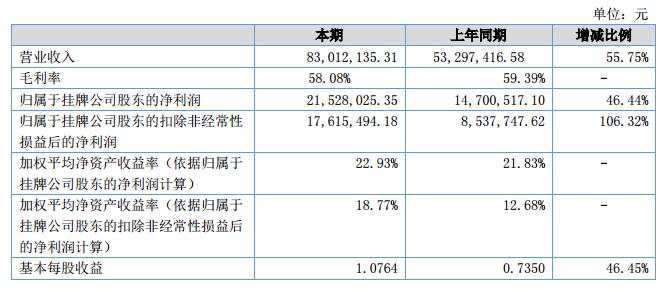 報告期內(nèi),公司實現(xiàn)營業(yè)收入83,012,135.31元,較上年同期銷售收入53,297,416.58元增長55.75%;公司凈利潤為21,528,025.35元,較上年同期凈利潤14,700,517.10元,增長了46.44%。公司實現(xiàn)總資產(chǎn)191,438,469.47元,凈資產(chǎn)97,131,213.36元。?
